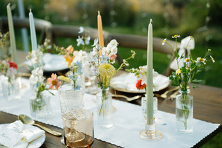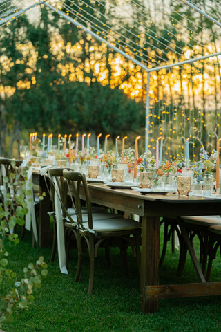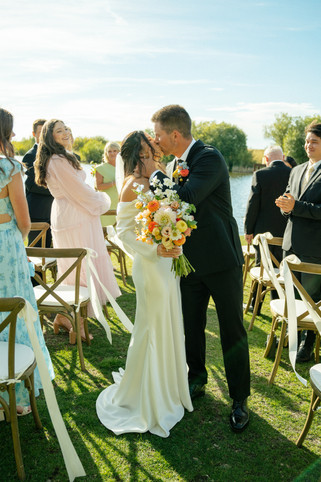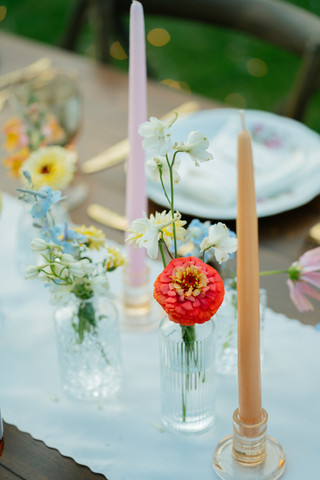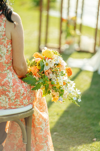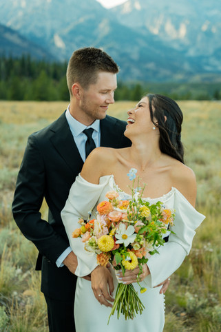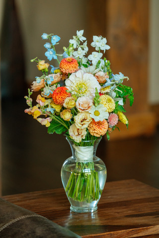 Farm fresh flowers shine in this Ashton, Idaho wedding. A Petite bouquet and scattered bud vases are simple yet impactful as they create a cheery atmosphere for the happy couple. Melon tones and a touch of blue draw in the beautiful mountain scenery.