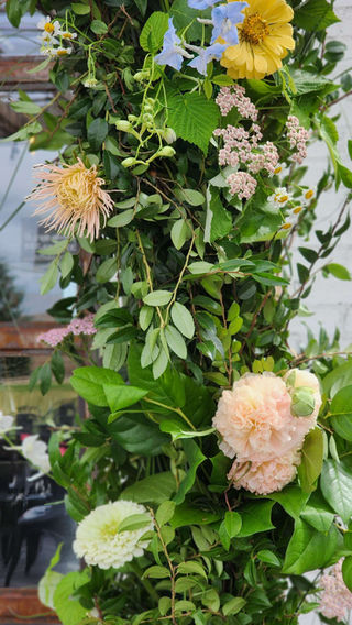 Warm sunset tones paired perfectly with a touch of cool blue creating a cheery yet elegant look. Lush Snapdragons, ruffly Hollyhocks, wispy Delphinium, fluttery Cosmos, dainty Feverfew... this wedding has it all. This lovely couple looked stunning beneath a towering floral arch.