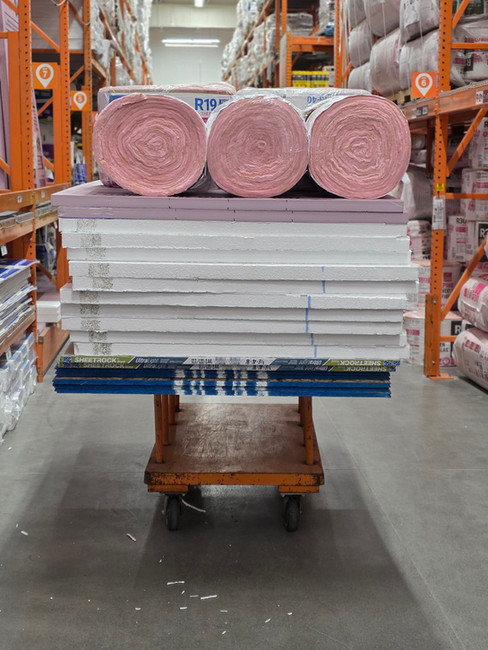 The next step was buying supplies. We needed boards to build walls, insulation, and sheetrock to cover the bare insulation. Several Home Depot trips later, we were stocked up!